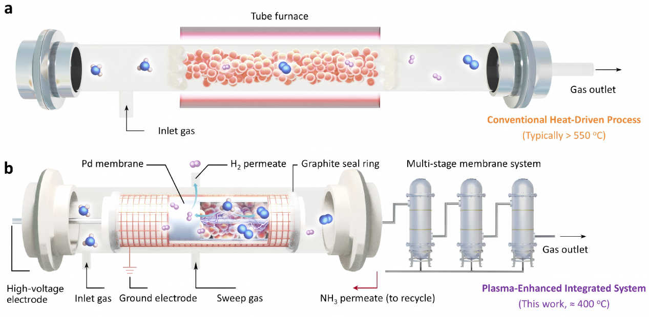 氨(NH3)作为一种主要的零碳氢载体,在未来可持续能源体系中占有重要地位。然而,传统的催化氨分解技术受热力学和动力学限制,通常需要550 ℃以上的高温,导致能耗高、催化剂易烧结。将反应与产物原位分离相结合的膜反应器技术是解决这一难题的有效策略。其中,钯(Pd)基复合膜因其对H2的优异选择性渗透能力,能原位移除产物H2,打破反应的平衡限制,从而提高氨的单程转化率。然而,传统热驱动钯膜反应器仍受限于催化剂在低温下的活性不足问题。